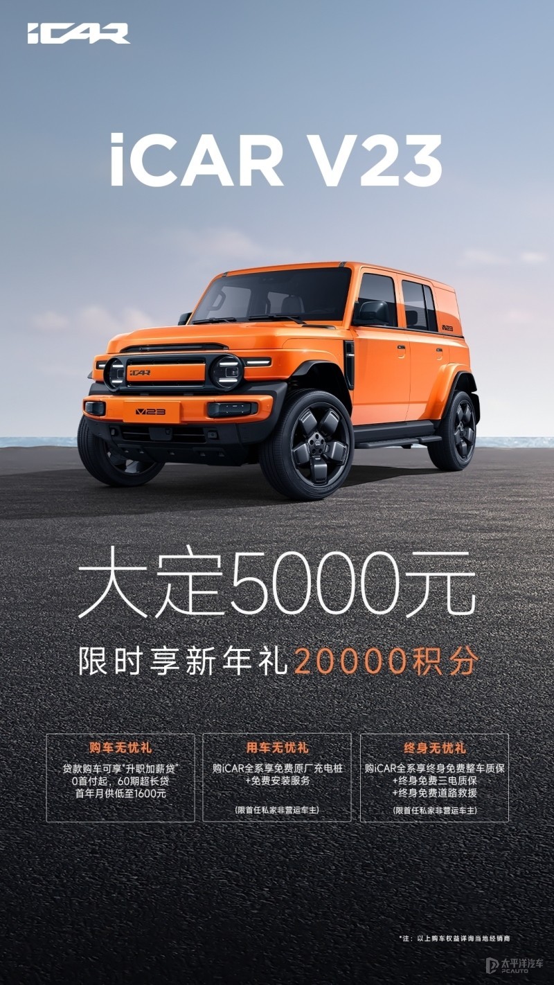 2025年伊始,iCAR品牌还推出新春回馈活动:即日起至2025年2月28日(含),在iCAR App支付5000元下定锁单iCAR V23的用户,可获得2万积分,积分可兑换官方商城精品或2000元置换/金融补贴。对于因购车时间无法享受后续政府置换补贴的用户,iCAR提供兜底补贴,确保用户购车无忧。综合最新发布的“国补”和政策权益,符合条件的换新用户购买iCAR V23各车型优惠至高2.2万元。